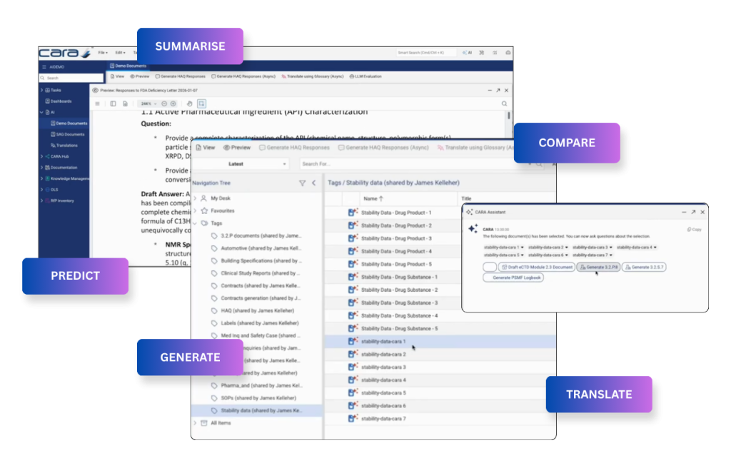 The more of your operations run on CARA, the more your AI can do. Regulatory, Safety, Quality, and Clinical on one platform