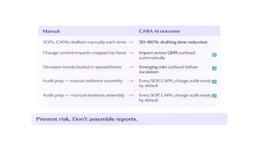 Sub-copy: CARA manages your full Quality function on one governed platform — QMS, SOPs, change controls, deviations, and CAPAs. Add CARA AI when you’re ready — SOP and CAPA drafting time reduced by 50–80%, deviation trends surfaced before they escalate, and change control impacts mapped automatically.