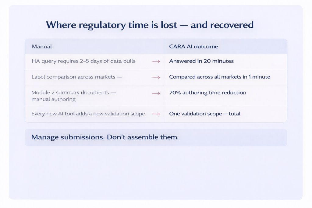 Every manual step is a delay you pay for twice. CARA runs your full regulatory operations on one platform. CARA AI handles the heavy lifting: HA queries answered, change impacts mapped, submission baselines generated. In minutes. Inside your governance framework, not around it.