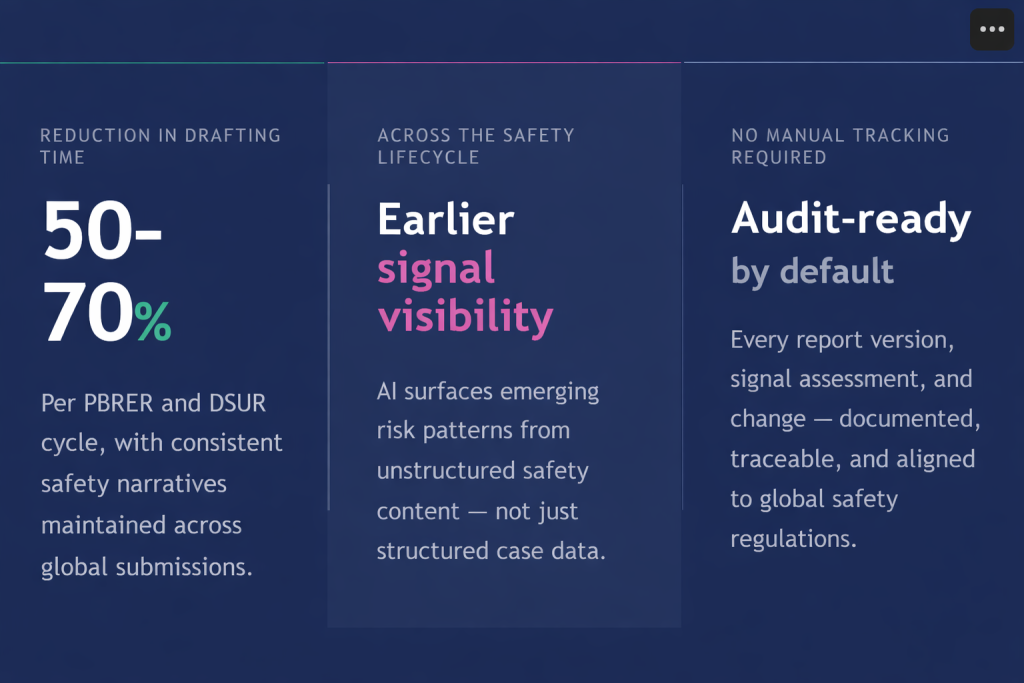 Across the full Safety function from aggregate reports and signal assessments to RMPs, DHPCs, and inspection packs your team writes, compares, summarises,