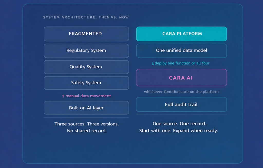 A label comparison that also checks safety signals. A CAPA that surfaces related deviations across sites. A submission that draws from clinical, regulatory, and quality content simultaneously. These use cases only exist on a unified platform.