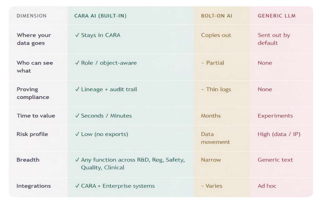 CARA AI runs on the same unified foundation already deployed across the world’s leading pharmaceutical companies. The platform that makes this AI possible has been proven in production, at scale, under inspection, across every major life sciences function.
